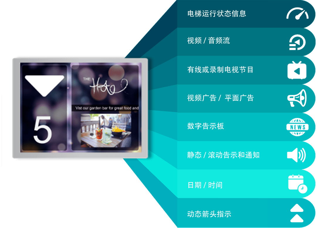 自带预设界面设计,也可通过USB或LAN自定义界面内容,支持电梯运作时的状态信息、视频及音频流媒体高清播放、静态或滚动公告和通知、楼层租户信息及广告、有线电视或录制电视节目播放等。丰富的娱乐信息和内容,将为您打造完美的视觉体验。