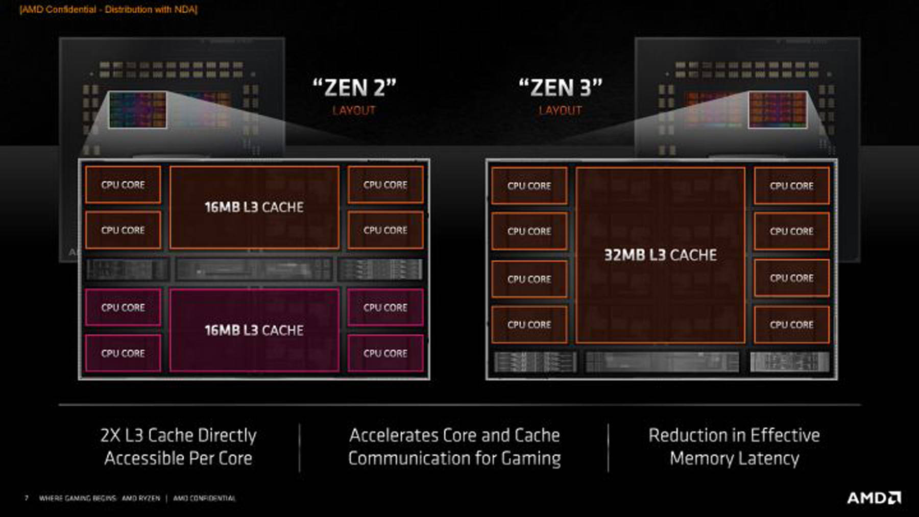 除了IPC的性能提升之外,ZEN3架构又同时重新改进了三级缓存的结构设计。之前ZEN2架构中的CCD单元是2个CCX模块,每个CCX模块含有4个核心和16MB三级缓存,但模块之间彼此是相互隔离的。